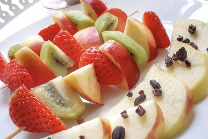 Snij het fruit in stukjes en prikken maar. Je kunt er eventueel nog wat cacoa nibs